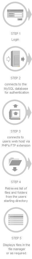 3. Once this connection is established, a list of files and folders are retrieved from the end-users starting directory (specified when the user account is created). These files and folders are then displayed in the Website Edit Center file manager or as required.